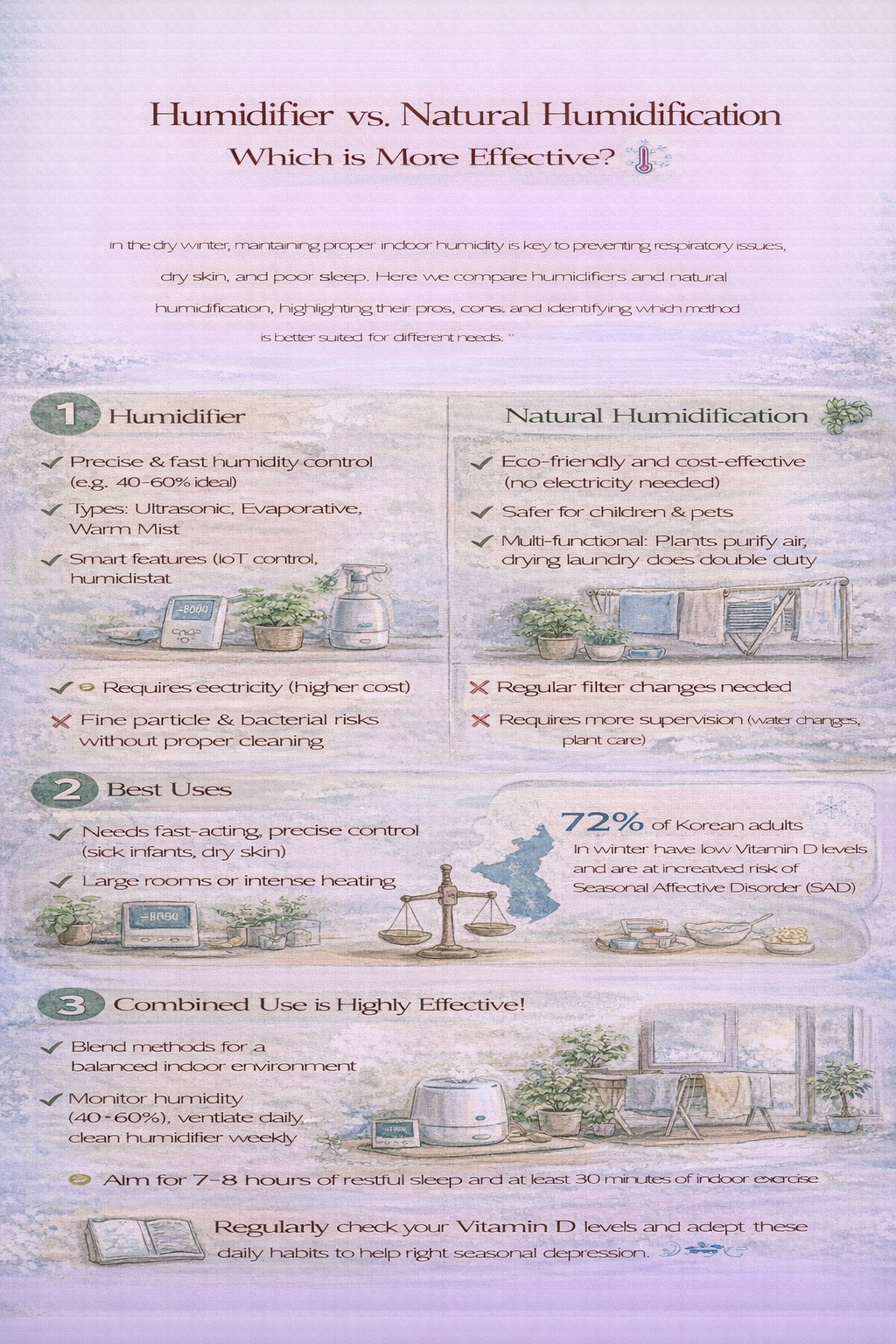 결론적으로, 가습기는 정밀하고 강력한 습도 조절에 효과적이며, 자연 가습은 안전하고 유지비가 거의 없는 친환경 방식입니다. 가장 이상적인 방법은 두 방식을 병행하여 사용하는 것이며, 공간과 생활 패턴에 맞는 선택이 중요합니다.