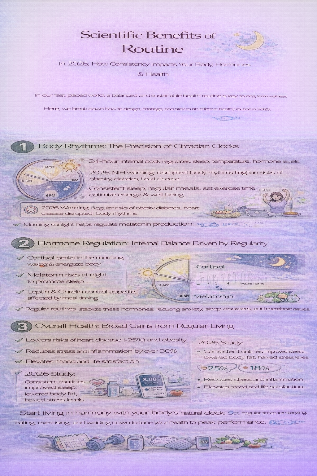 우리는 본능적으로 안정과 예측 가능성을 원하며, 이는 과학적으로도 입증된 생리적 사실입니다. 규칙적인 루틴은 신체리듬을 맞추고, 호르몬을 조화롭게 분비시키며, 궁극적으로 건강 전반을 최적화하는 검증된 건강 전략입니다. 오늘도 비슷한 시간에 일어나고, 식사하고, 운동하며, 잠드는 습관을 통해 여러분의 건강을 과학적으로 설계해 보세요. 작은 반복이 위대한 건강을 만듭니다.