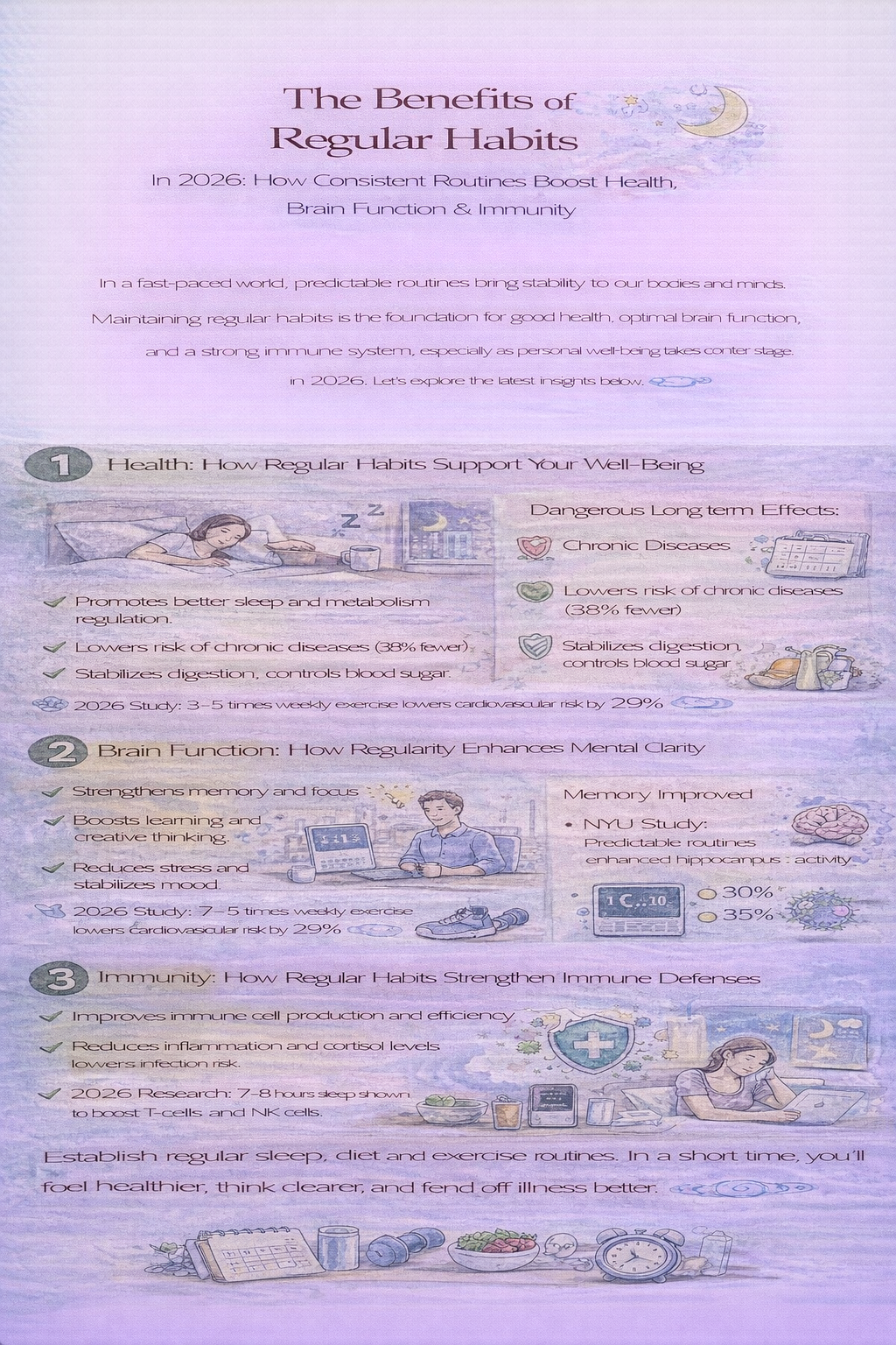 현대 사회는 속도와 변화를 중심으로 돌아가지만, 우리의 몸과 마음은 오히려 안정성과 예측 가능성을 필요로 합니다. 이러한 균형을 맞춰주는 핵심 요소가 바로 규칙적인 습관입니다. 규칙성은 단순히 반복되는 일상이 아니라, 건강을 지키고 뇌기능을 활성화하며 면역 체계를 튼튼히 하는 강력한 기반이 됩니다. 특히 최근 들어 자기 관리와 웰빙의 중요성이 부각되면서 규칙적인 루틴의 필요성은 더욱 커지고 있습니다. 이 글에서는 규칙적인 습관이 건강, 뇌기능, 면역력에 어떤 긍정적인 영향을 주는지 최신 정보와 함께 자세히 살펴보겠습니다.