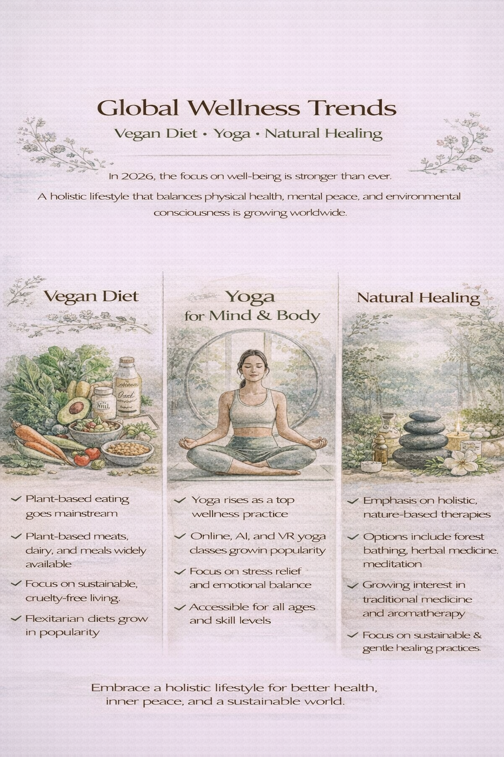2026년 현재, 전 세계적으로 웰빙에 대한 관심은 그 어느 때보다도 높아졌습니다. 단순히 건강을 지키는 차원을 넘어, 신체적·정신적·환경적 균형을 추구하는 글로벌 웰빙 라이프스타일이 새로운 문화로 자리 잡고 있습니다. 특히 비건식, 요가, 자연치유는 대표적인 웰빙 키워드로, 전 세계에서 각광받고 있는 실천법입니다. 이 글에서는 2026년 기준 글로벌 웰빙 트렌드의 중심이 되는 세 가지 키워드를 중심으로 변화된 건강 문화 흐름을 알아보겠습니다.