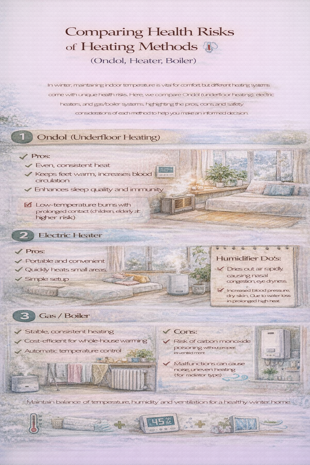 온돌, 히터, 보일러는 각각의 장점과 함께 건강에 영향을 미칠 수 있는 요소들을 가지고 있습니다. 온돌은 체온 유지에 좋지만 건조함과 저온 화상에 주의해야 하고, 히터는 편리하지만 건조·산소 부족·화재 위험이 큽니다. 보일러는 효율적이지만 일산화탄소와 과도한 난방으로 인한 건강 문제를 관리해야 합니다. 겨울철 건강한 실내 환경을 위해서는 난방 방식 선택과 함께 적정 온도 유지, 습도 관리, 정기적인 환기를 반드시 병행하는 것이 가장 중요합니다.