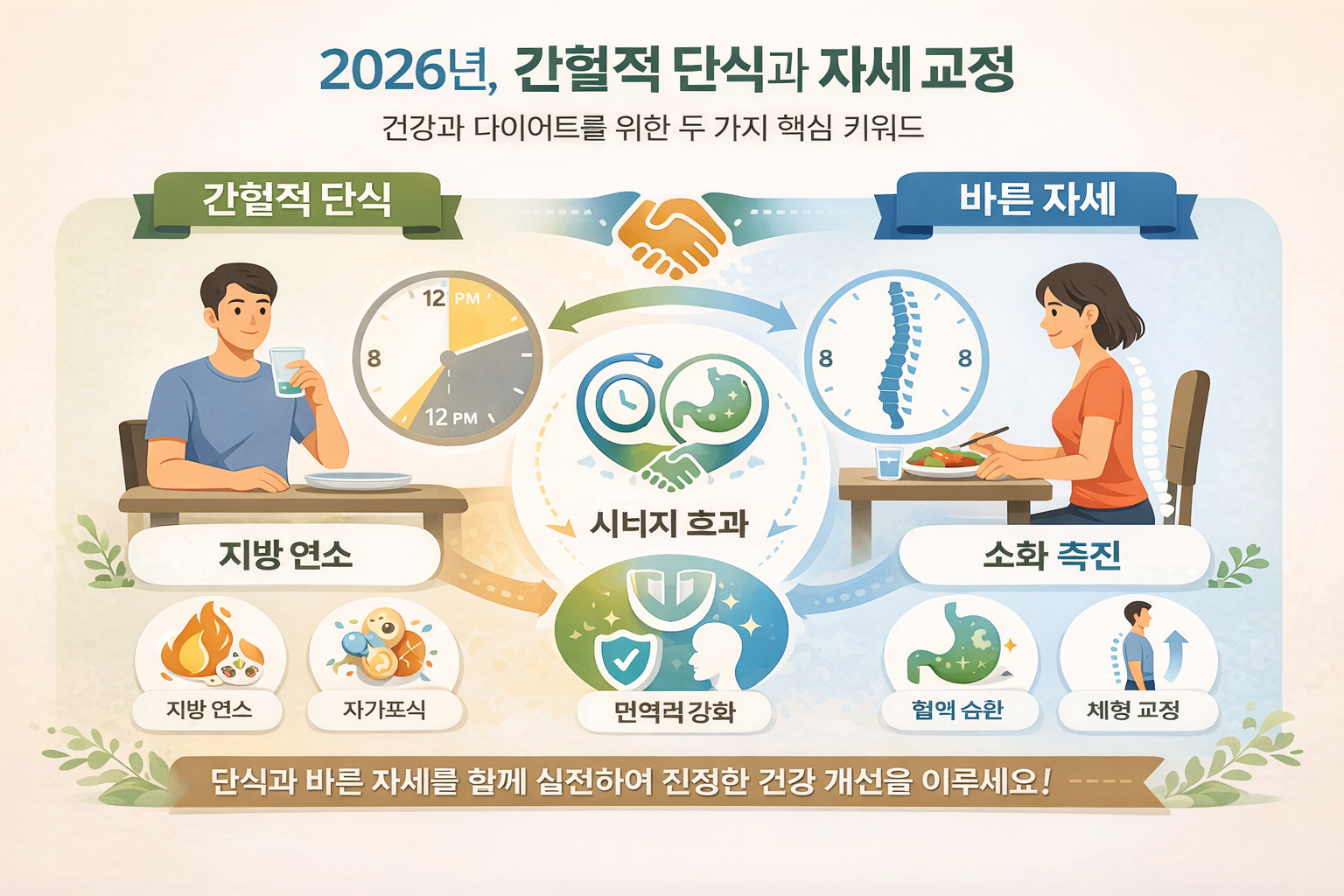 2026년 현재, 간헐적 단식과 자세 교정은 건강과 다이어트에 있어 두 가지 핵심 키워드로 주목받고 있습니다. 많은 사람들이 식단 조절에만 집중하는 반면, 자세까지 함께 관리할 때 신진대사와 내장 기능 개선에 훨씬 더 긍정적인 효과를 볼 수 있습니다. 이 글에서는 단식의 건강 효과와 바른 자세가 결합될 때의 시너지 효과에 대해 자세히 알아봅니다.