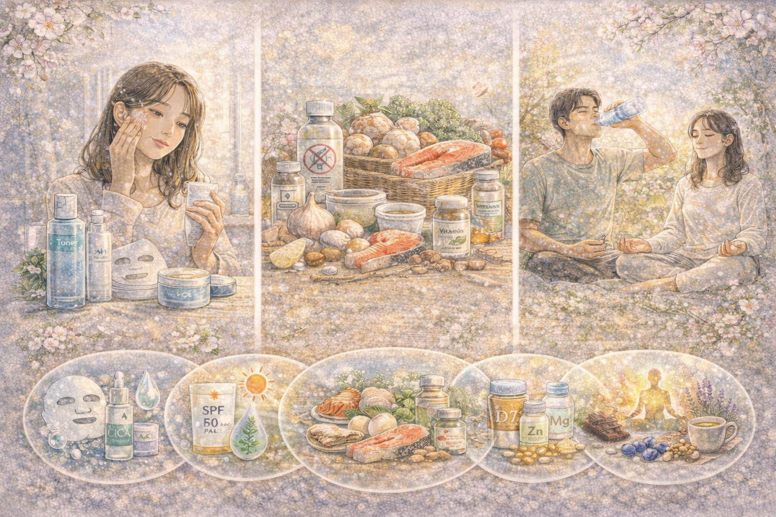 수분 공급은 봄철 피부 관리의 시작입니다. 낮은 습도와 잦은 외부 활동으로 인해 피부 속 수분이 빠르게 증발하므로, 수분 베이스 토너와 히알루론산 성분이 함유된 크림으로 보습을 철저히 해야 합니다. 진정 관리 또한 필수입니다. 병풀추출물(CICA), 알란토인, 판테놀 등의 진정 성분이 포함된 제품은 외부 자극으로 민감해진 피부를 안정시켜 줍니다.