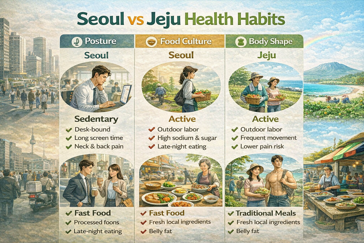 서울과 제주는 서로 다른 환경 속에서 독특한 건강 습관을 형성해왔습니다. 서울은 정보와 속도의 도시로, 빠른 삶의 리듬 속에서 자세, 식습관, 체형에 문제가 생기기 쉽습니다. 반면 제주는 자연과 함께하는 느린 삶을 통해 비교적 건강한 생활습관을 유지하고 있지만, 반복적 육체노동에 의한 부담도 함께 존재합니다.