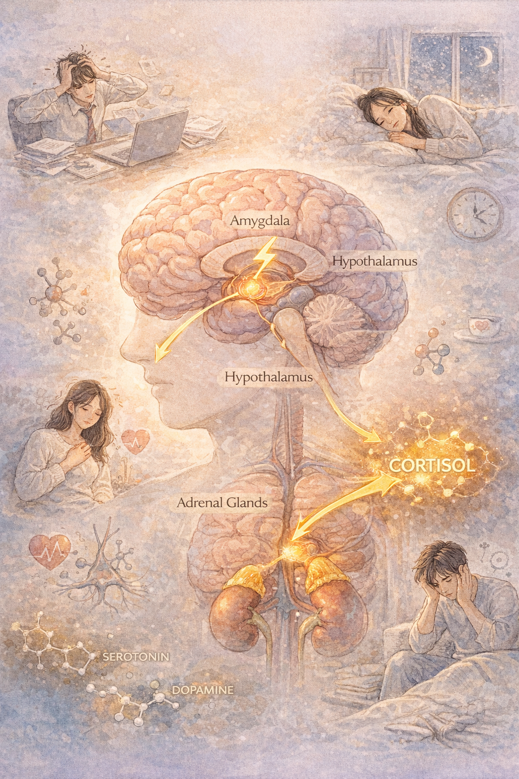 스트레스를 받을 때 우리 뇌는 즉각적으로 위협을 인식하고, 이에 반응하기 위한 일련의 생물학적 메커니즘을 작동시킵니다. 가장 먼저 관여하는 뇌 영역은 편도체(Amygdala)입니다. 편도체는 위험을 감지하고, 감정적 반응을 조절하는 역할을 합니다. 예를 들어 상사에게 질책을 받았을 때 편도체는 이를 ‘위협’으로 해석해 즉각적인 생리 반응을 유도합니다.
