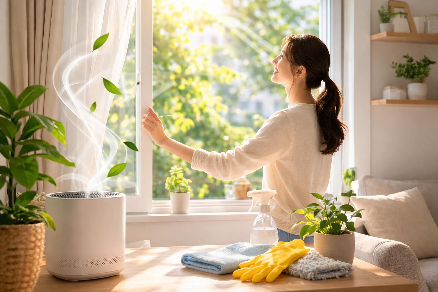 환기는 가장 기본적인 공기 관리 방법입니다. 하루 2~3회 정도 창문을 열어 약 10~20분 동안 공기를 순환시키면 실내에 쌓인 이산화탄소와 먼지를 줄일 수 있습니다. 특히 요리 후나 청소 후에는 환기를 하는 것이 좋습니다.