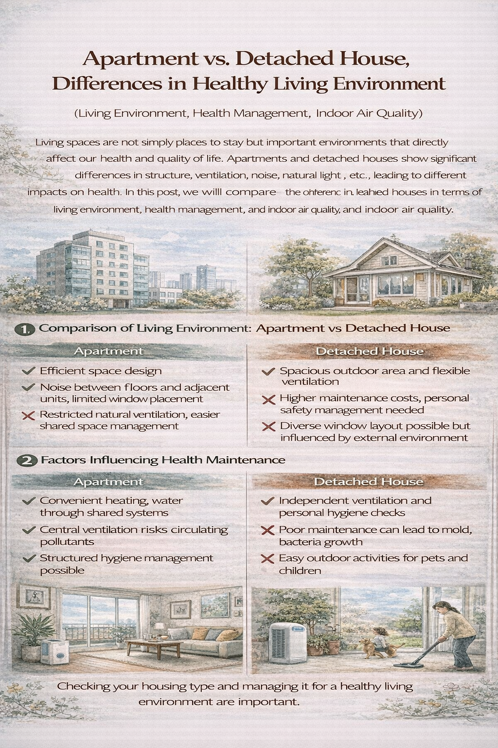 아파트와 단독주택은 각기 다른 구조와 특성으로 인해 건강환경에 다양한 영향을 미칩니다. 생활환경, 건강관리, 실내공기질 측면에서 각각의 장단점을 이해하고, 자신의 생활 방식과 가족 구성원에 맞는 선택을 하는 것이 중요합니다. 단순한 주거 공간의 선택을 넘어, 삶의 질을 높이고 건강을 지키는 첫걸음으로서 주거환경을 다시 점검해보시길 바랍니다.
