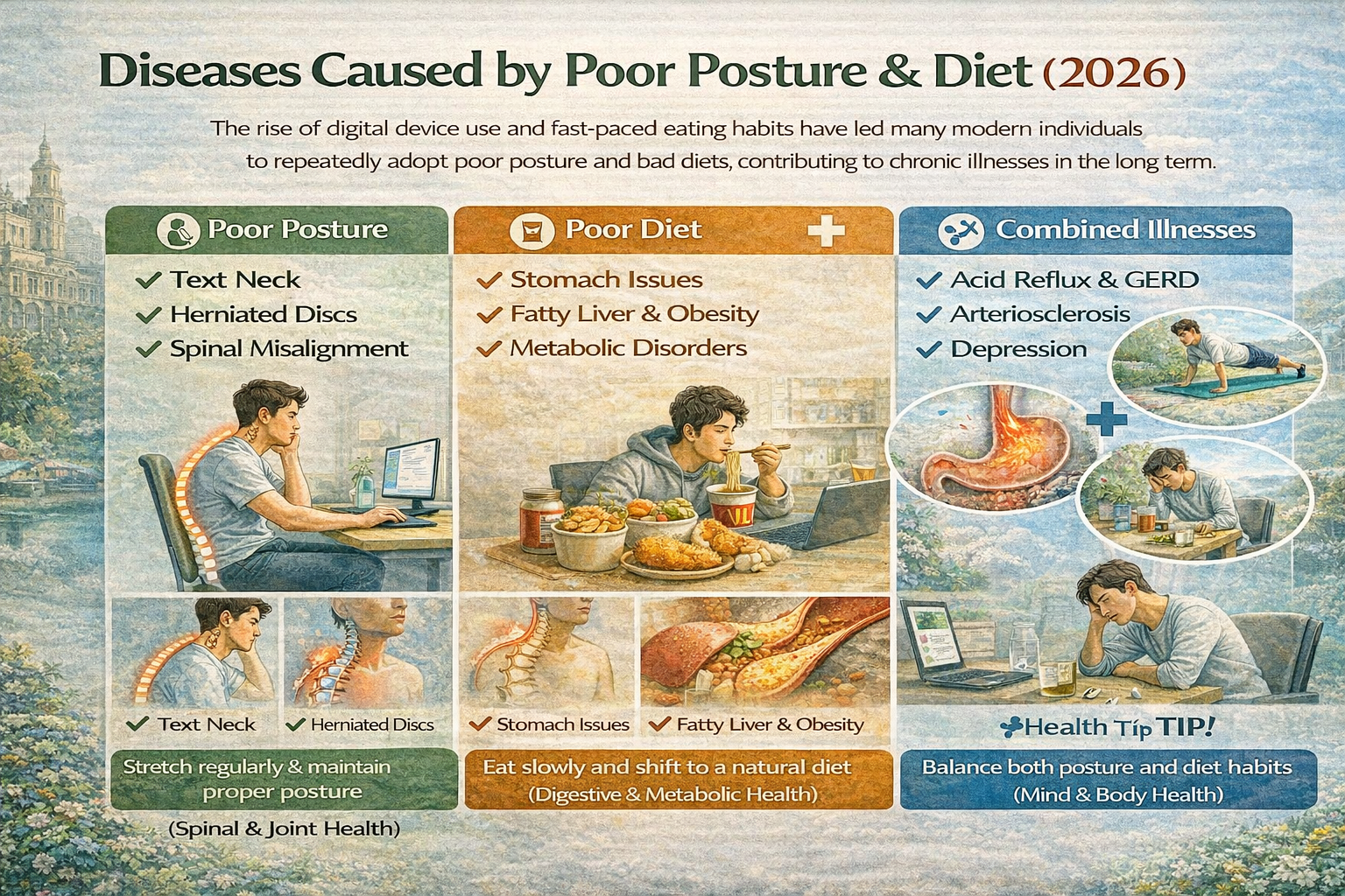 2026년 현재, 디지털 기기 사용 증가와 불규칙한 생활습관은 많은 현대인들에게 나쁜 자세와 잘못된 식습관을 반복하게 만들고 있습니다. 바쁜 일상 속에서 앉은 자세로 오랜 시간을 보내며, 편의점 음식이나 패스트푸드로 끼니를 때우는 것이 일상이 되어버렸죠. 그러나 이러한 습관은 단순한 피로와 불편함을 넘어, 몸속에서 서서히 건강을 무너뜨리는 만성질환으로 이어질 수 있습니다. 본 글에서는 2026년 현재 기준으로, 잘못된 자세와 식습관이 유발하는 질병의 유형과 그 심각성에 대해 구체적으로 살펴보고, 이를 개선하기 위한 현실적인 방법들을 함께 알아보겠습니다.