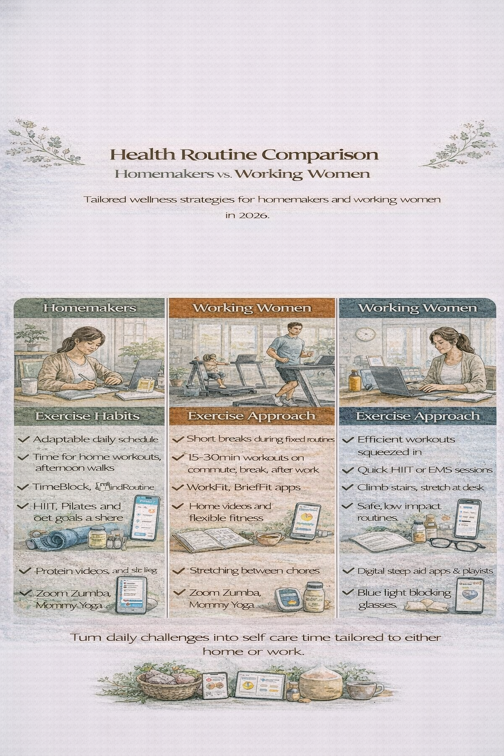 2026년 현재, 여성의 건강 관리 루틴은 '시간이 있는가'가 아니라, '시간을 어떻게 쓰는가'가 핵심이 되고 있습니다. 특히 전업주부와 직장 여성은 삶의 구조 자체가 다르기 때문에 건강을 챙기는 방식도 명확한 차이를 보입니다. 이 글에서는 시간관리, 운동방식, 정신 건강(멘탈)이라는 세 가지 키워드를 중심으로 두 그룹의 루틴을 비교하고, 실질적인 전략을 함께 제시합니다.