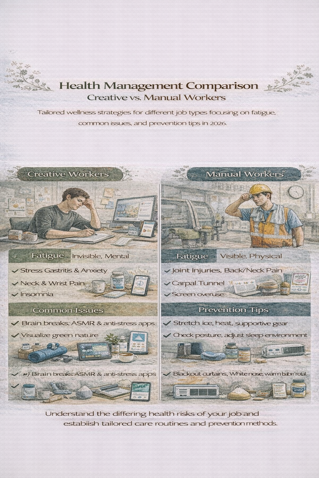 직업에 따라 건강을 챙기는 방식은 근무 환경과 업무 특성에 따라 크게 달라집니다. 특히 창작직(디자이너, 작가, 콘텐츠 기획자 등)과 생산직(현장 제조, 조립, 운반 등)은 육체·정신적 에너지 소모의 방향 자체가 다르기 때문에 건강관리에 있어서도 피로 유형, 질환 형태, 예방 접근법이 전혀 다릅니다. 2026년 현재 기준으로 이 두 직업군의 건강 이슈를 명확히 구분하고, 각자에 맞는 현실적인 건강 루틴과 예방 전략을 분석해 봅니다.