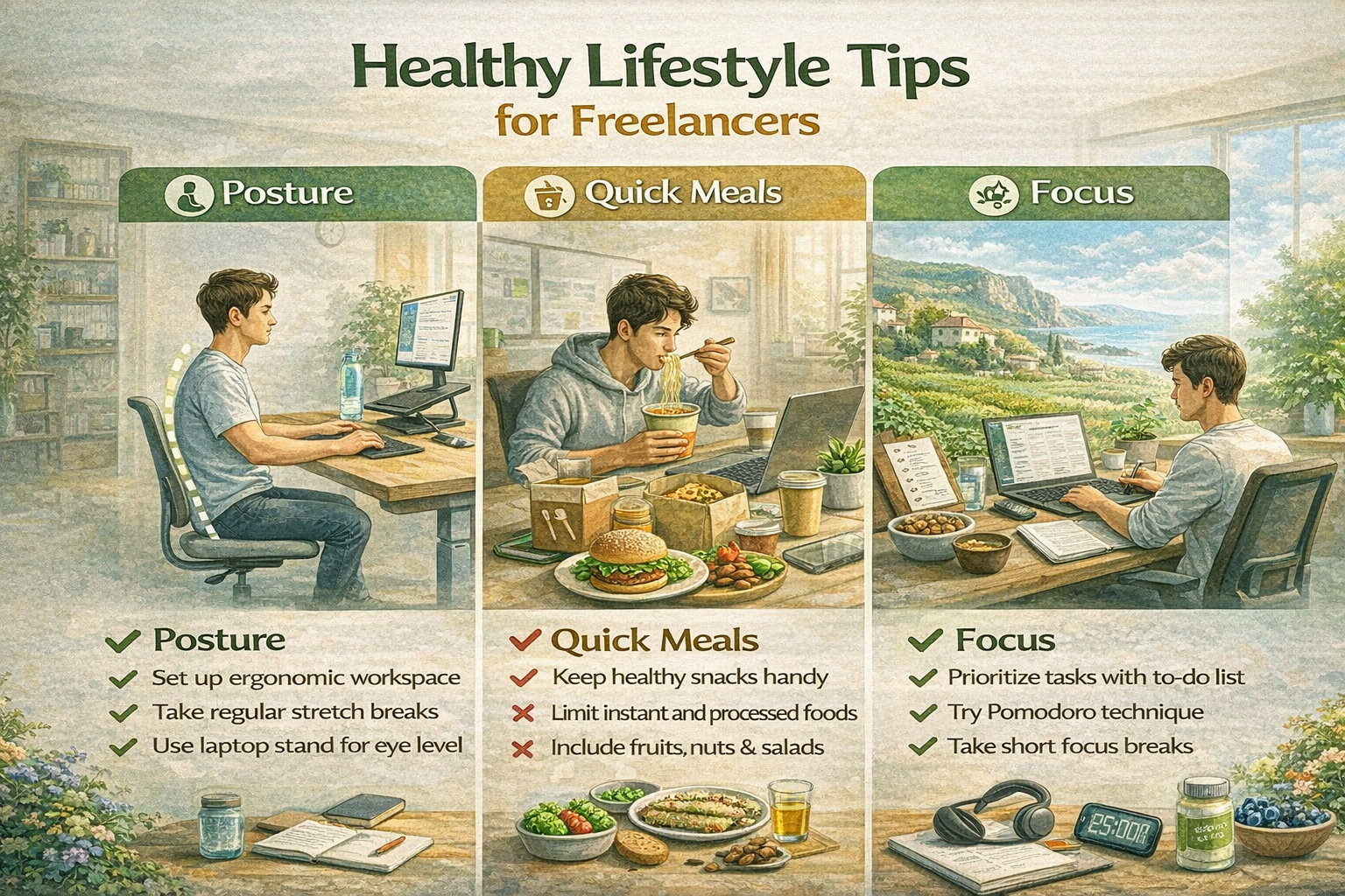 2026년 현재, 프리랜서 인구가 급속히 증가하면서 건강 관리에 대한 관심도 커지고 있습니다. 자유로운 근무 형태의 장점 뒤에는 규칙 없는 생활 습관과 건강을 해치는 요인이 숨어 있습니다. 특히 자세 문제, 간편식 위주의 식사, 집중력 저하 등은 많은 프리랜서들이 겪는 대표적인 건강 이슈입니다. 이 글에서는 프리랜서의 라이프스타일에 맞는 실질적인 건강관리 방법을 자세, 식습관, 집중력 향상이라는 세 가지 키워드로 정리해봅니다.