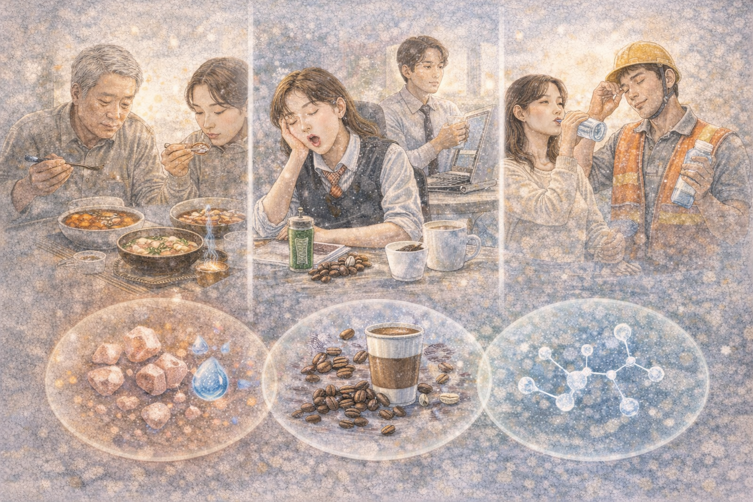 한국인은 김치, 찌개, 탕 등 국물 요리가 중심인 식생활로 인해 식사 중 어느 정도의 수분을 섭취하고 있다고 생각하는 경우가 많습니다. 하지만 순수한 물 섭취량은 여전히 WHO 권장 기준에 못 미치며, 생활 습관이나 연령, 직업적 특성에 따라 수분섭취 패턴도 매우 다양하게 나타납니다. 특히 짠 음식을 선호하고, 카페인 음료를 물 대신 마시는 경향은 수분 균형을 깨뜨릴 수 있습니다. 본 글에서는 한국인의 수분섭취 문화와 그에 따른 건강상 문제점, 세대별/직군별 차이점, 건강한 수분관리 전략에 대해 구체적으로 분석해 보겠습니다.
