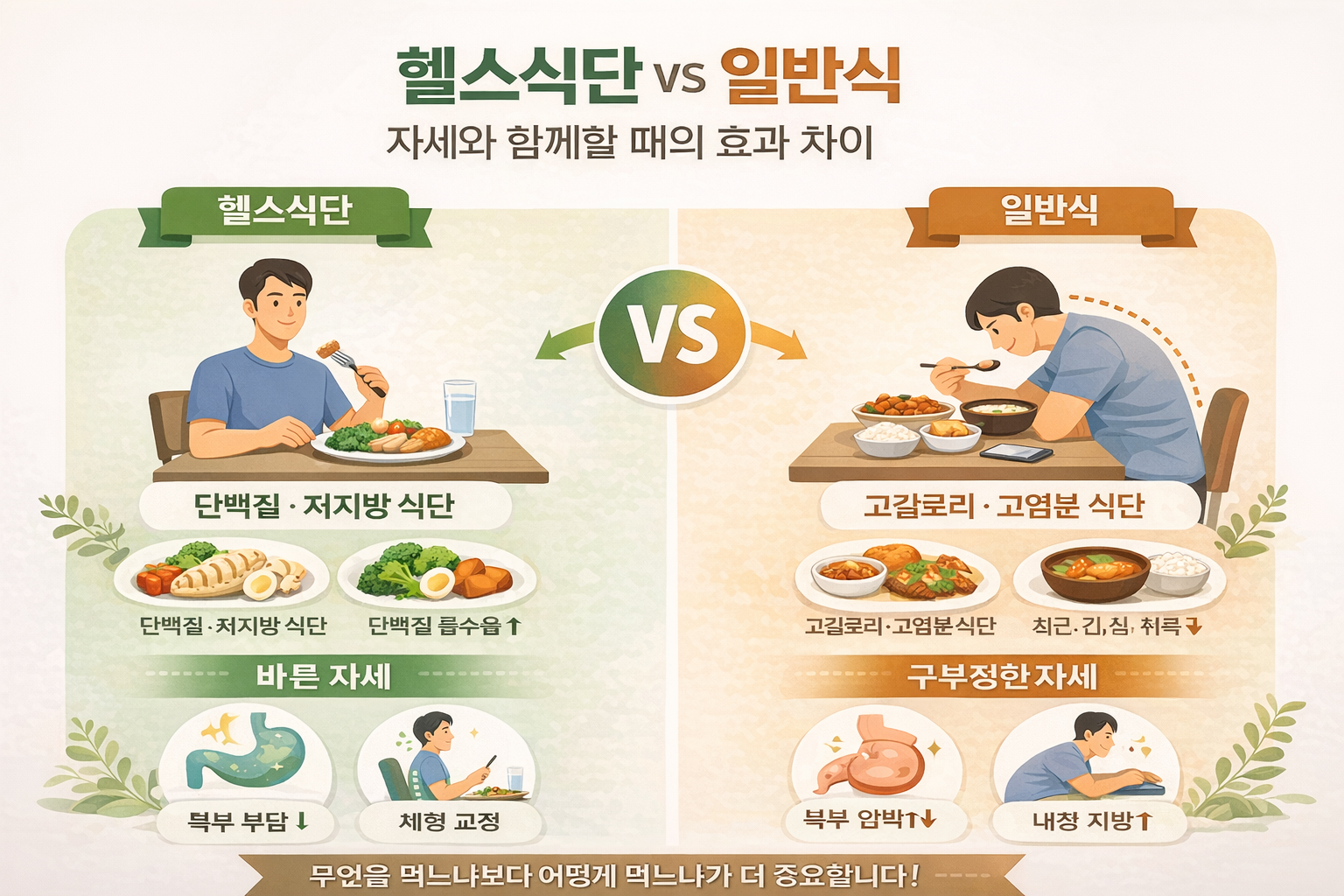 2026년 현재, 건강에 대한 관심이 높아지면서 헬스식단을 실천하는 사람들이 크게 늘고 있습니다. 반면, 일반적인 식단을 유지하는 다수의 사람들 사이에서도 ‘건강하게 먹는 법’에 대한 고민은 여전합니다. 여기에 더해 식사 시의 자세 습관이 건강에 미치는 영향도 주목받고 있습니다. 이 글에서는 헬스식단과 일반식의 특징과 건강 효과를 비교하고, 식사 자세와 결합했을 때 어떤 시너지가 발생하는지 함께 살펴봅니다.